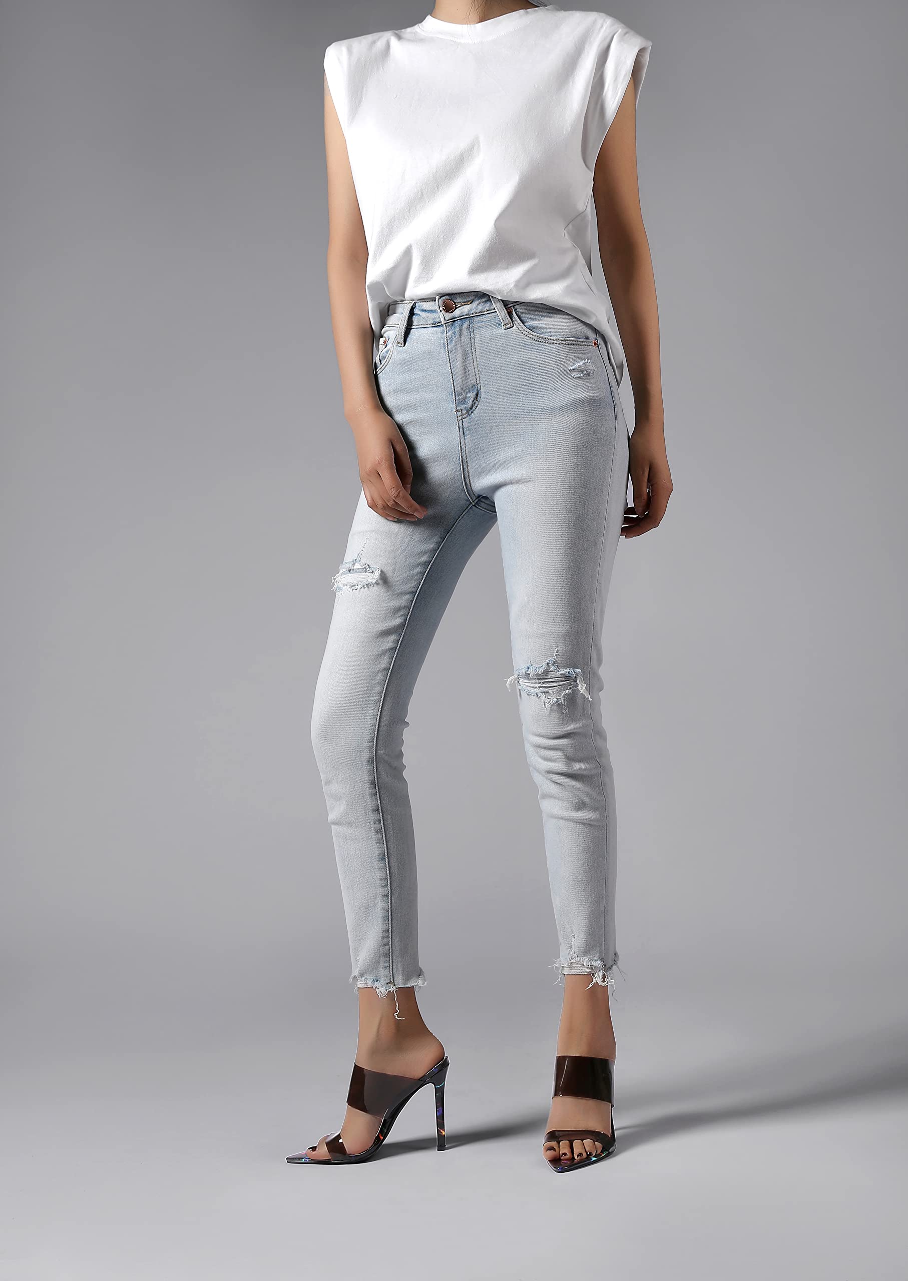 - Open toe, slip-on heel mules designed for both comfort and style. Transparent strappy heeled slides are a must-have for every fashionista’s wardrobe, exuding a love for fashion.